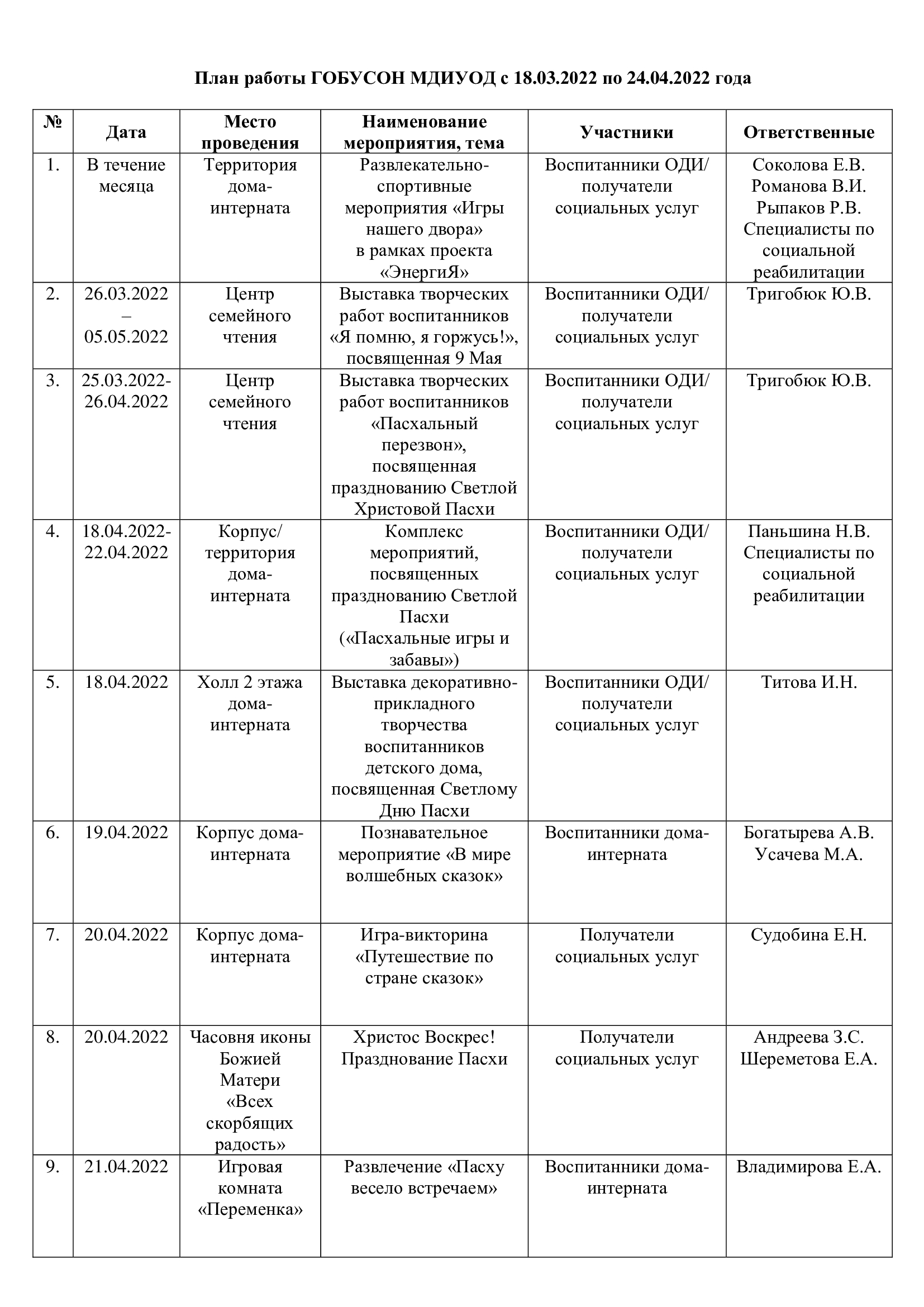 План работы ГОБУСОН МДИУОД с 18.04.2022 года по 24.04.2022 года