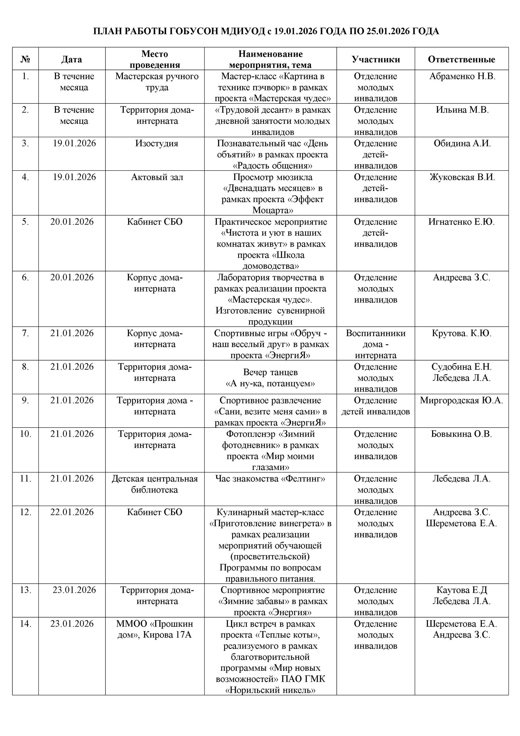 План работы ГОБУСОН МДИУОД с 19 января по 25 января 2026 года