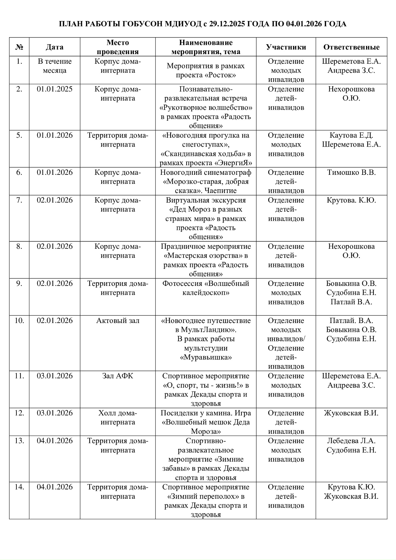 План работы ГОБУСОН МДИУОД с 24 декабря 2025 года по 04 января 2026 года