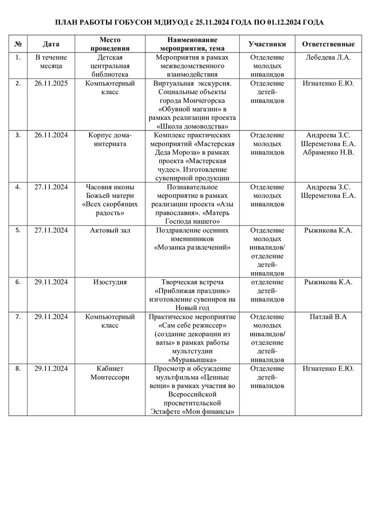 План работы ГОБУСОН МДИУОД с 26 ноября 2024 года по 01 декабря 2024 года