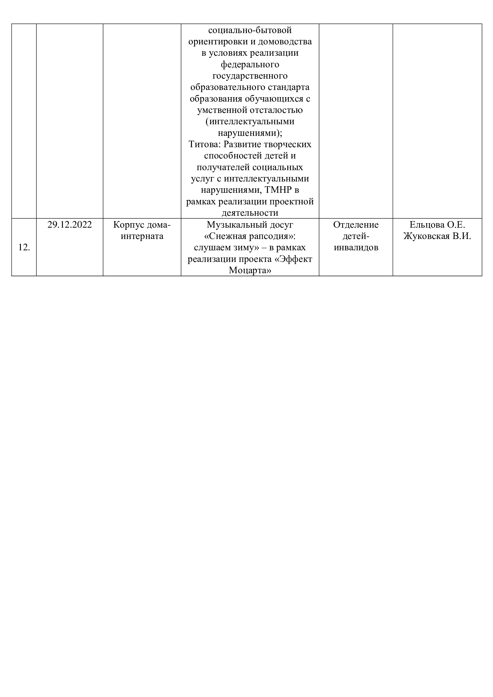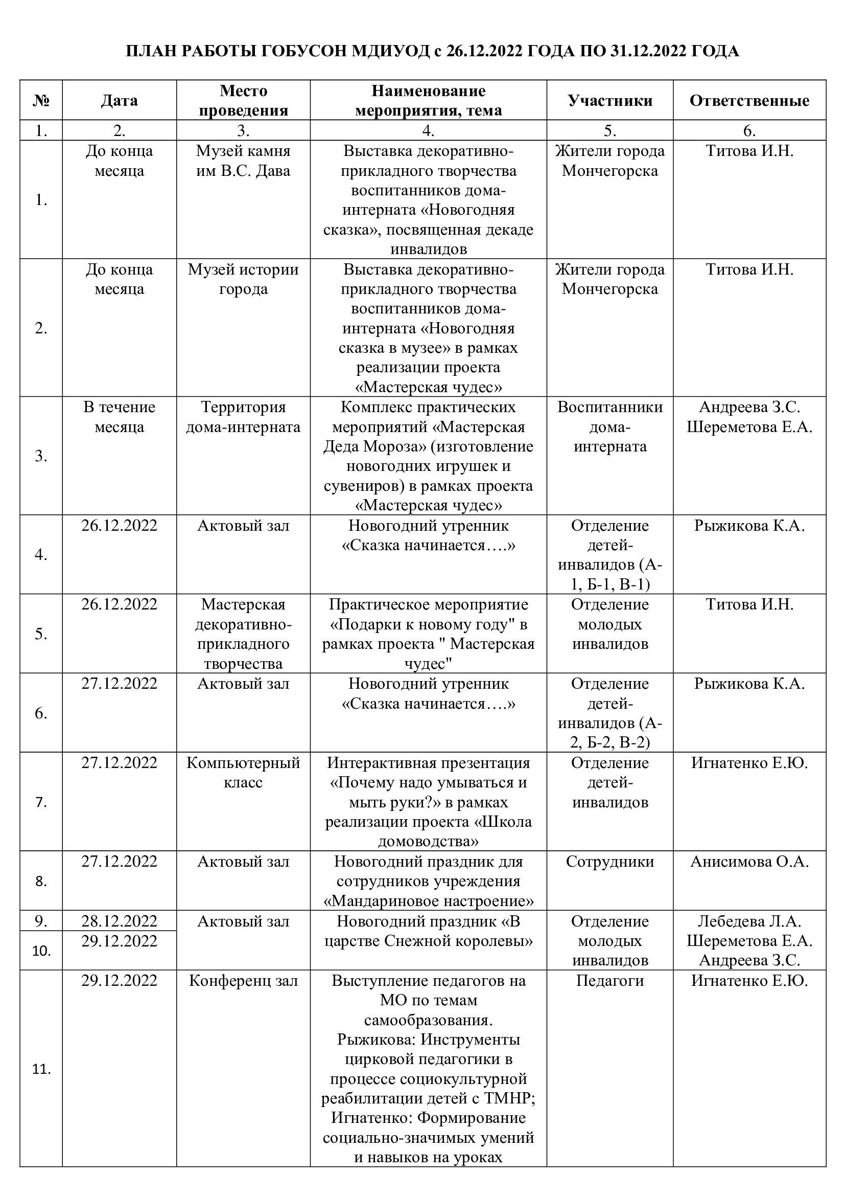 План работы ГОБУСОН МДИУОД с 26.12.2022 года по 31.12.2022 года.