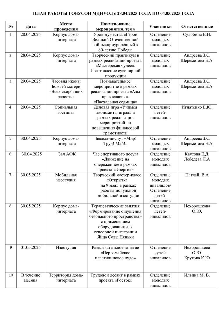 План работы ГОБУСОН МДИУОД с 28 апреля 2025 года по 04 мая 2025 года
