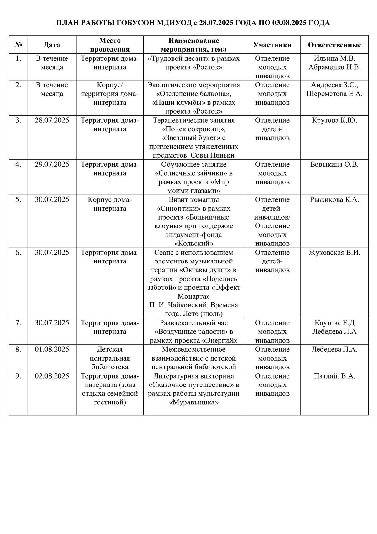 План работы ГОБУСОН МДИУОД с 28 июля 2025 года по 03 августа 2025 года