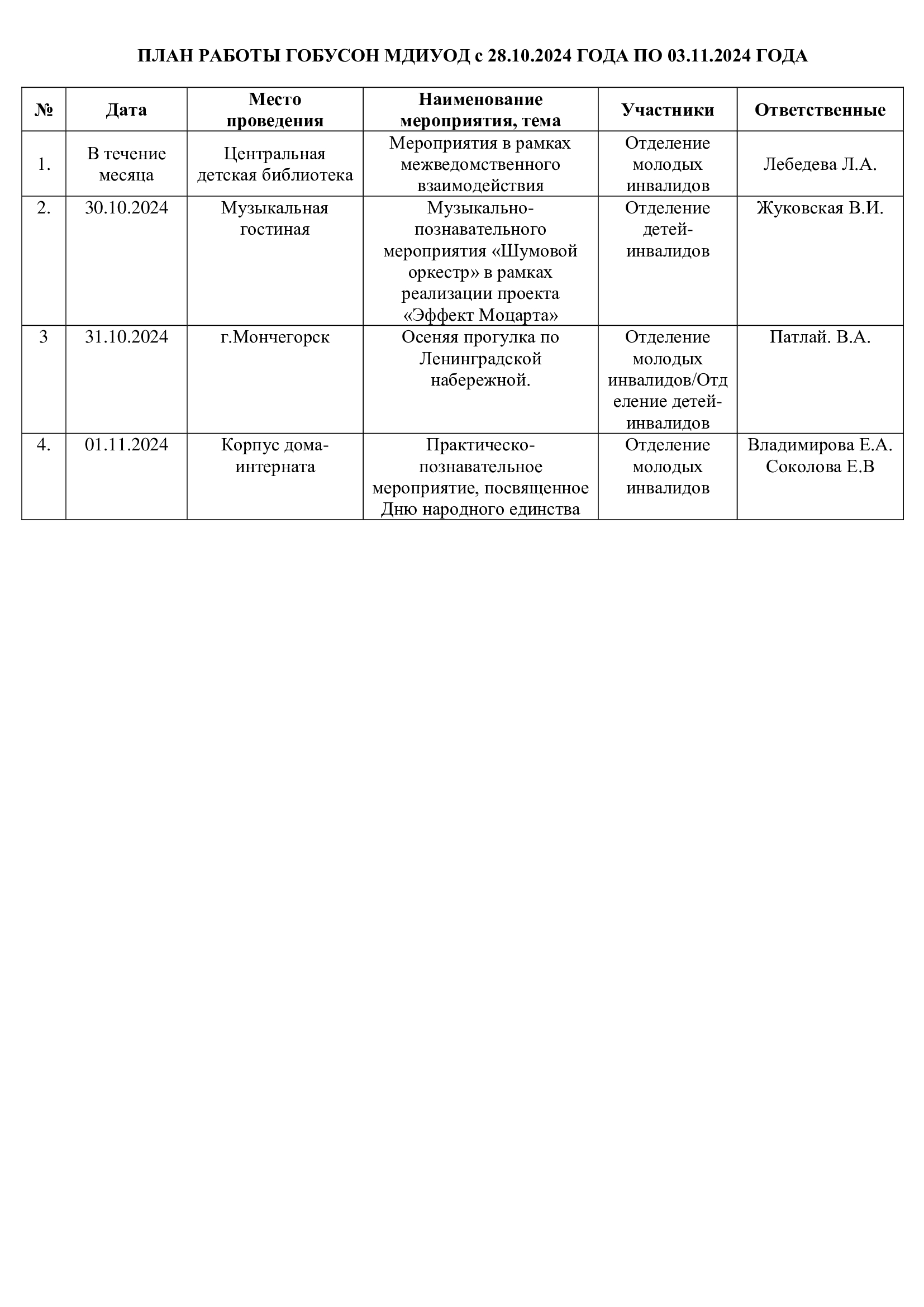 План работы ГОБУСОН МДИУОД с 28 октября по 03 ноября 2024 года