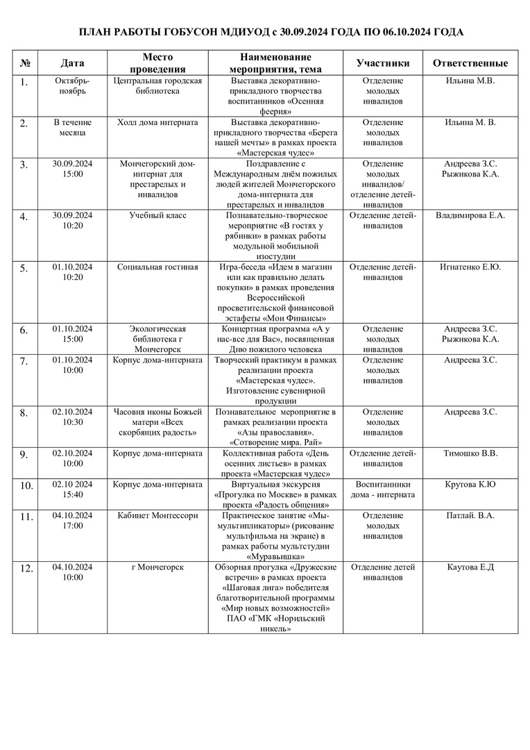 План работы ГОБУСОН МДИУОД с 30 сентября по 06 октября 2024 года