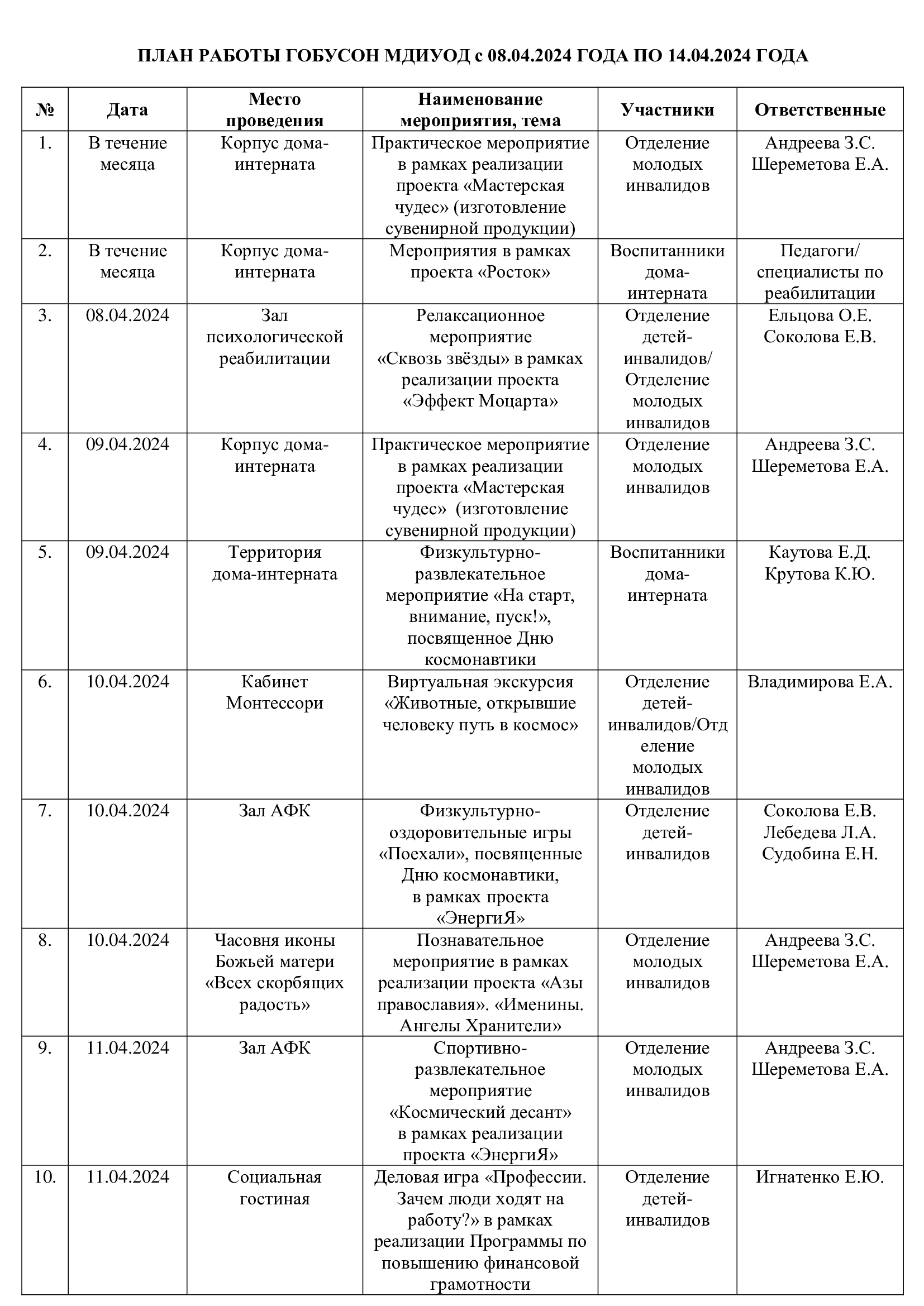 План работы ГОБУСОН МДИУОД с 8 апреля по 14 апреля 2024 года