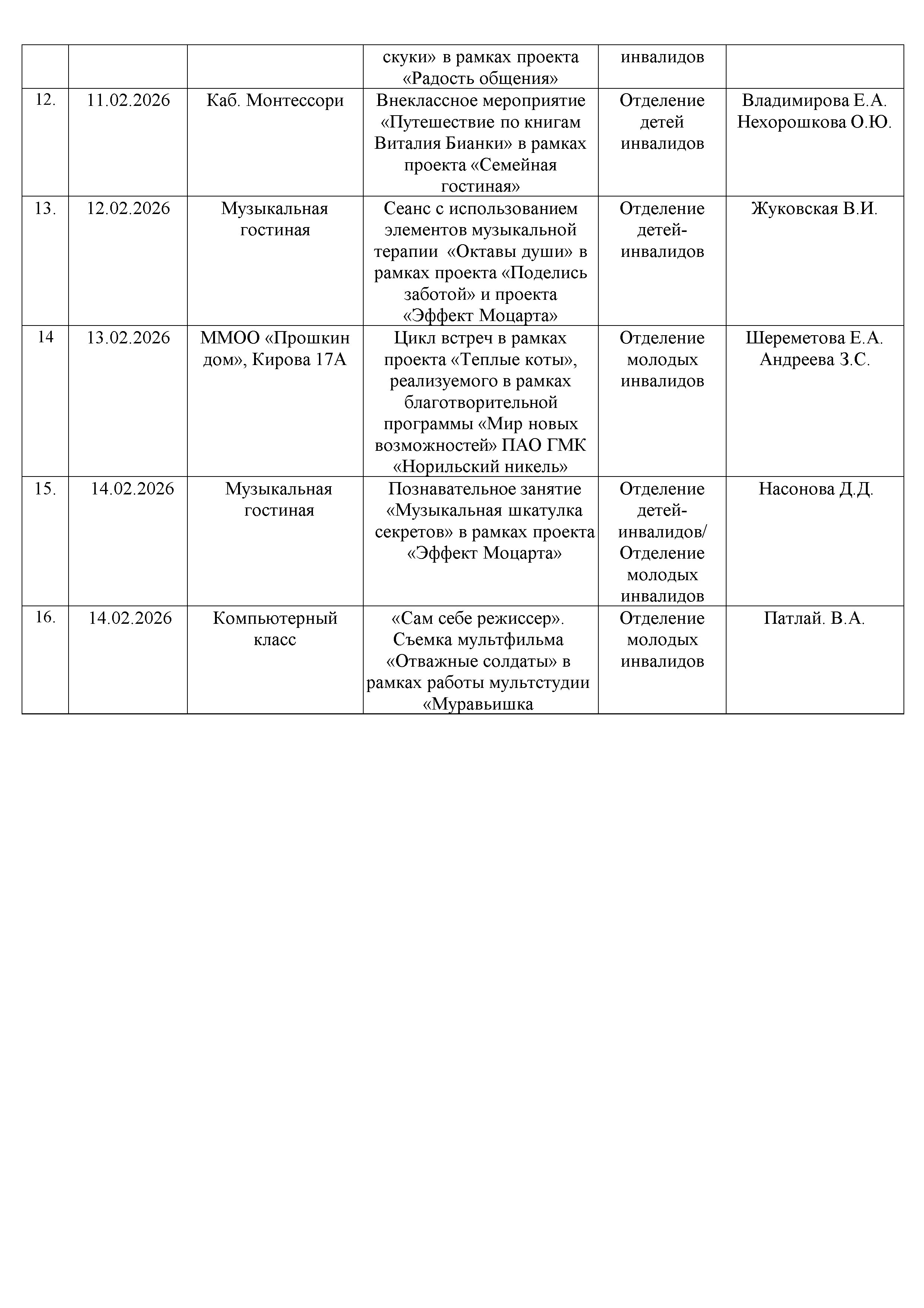 План работы Мончегорского дома-интерната с 09 февраля по 15 февраля 2026 года