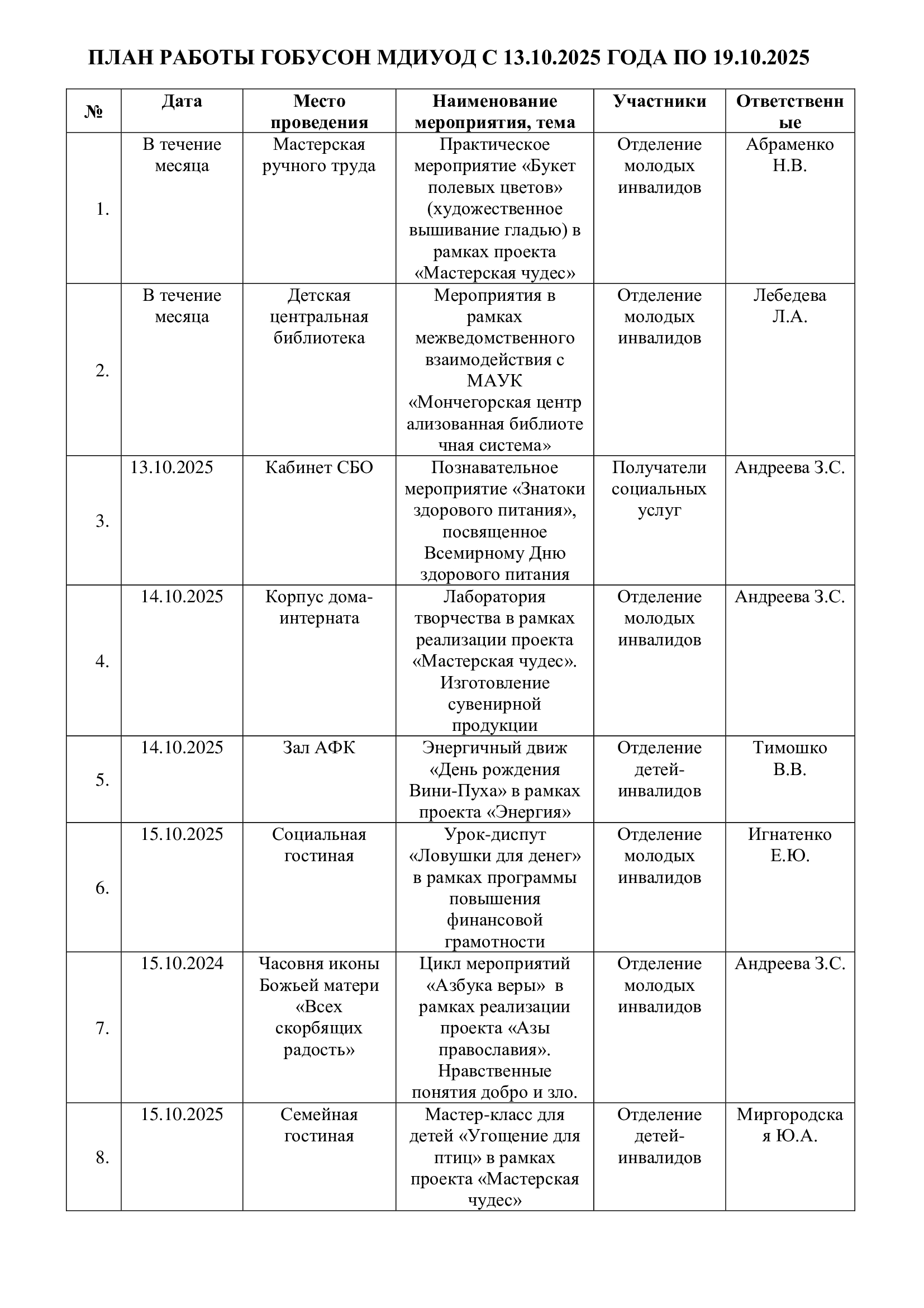 План работы с 13.10.25 по 19.10.25