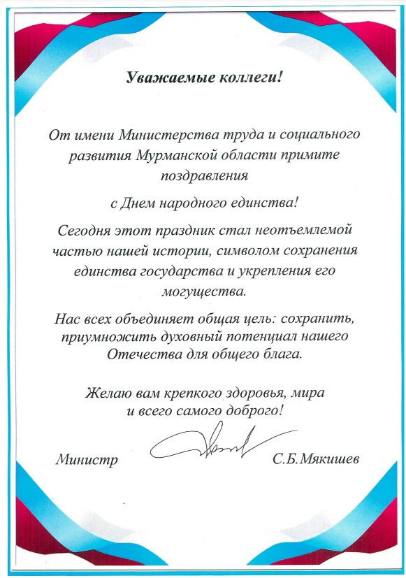 Поздравление с Днём народного единства от имени Министерства труда и социального развития Мурманской области