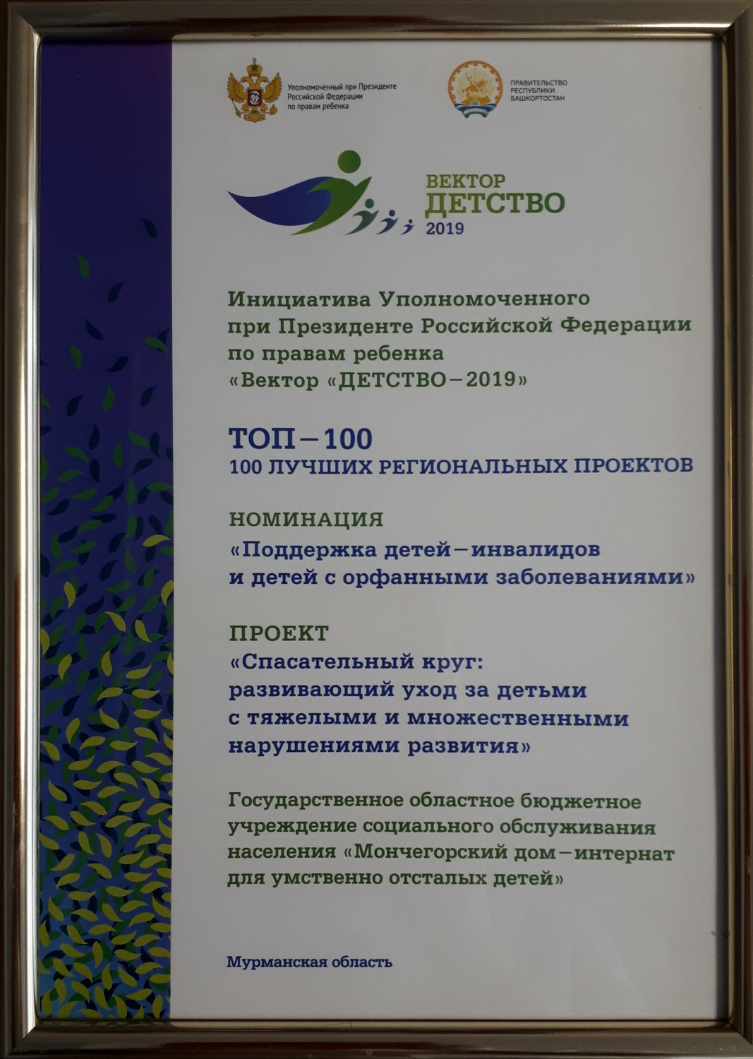 Мончегорский дом-интернат для умственно отсталых детей принял участие в Инициативе Уполномоченного при Президенте Российской Федерации по правам ребенка «Вектор «Детство-2019», цель которой – поддержка инновационных социальных государственных и общественных проектов в сфере защиты семьи и детства. На рассмотрение экспертной группы был представлен проект «Спасательный круг» (развивающий уход за детьми с тяжелыми множественными нарушениями развития), успешно реализуемый в учреждении в 2018-2019 гг.