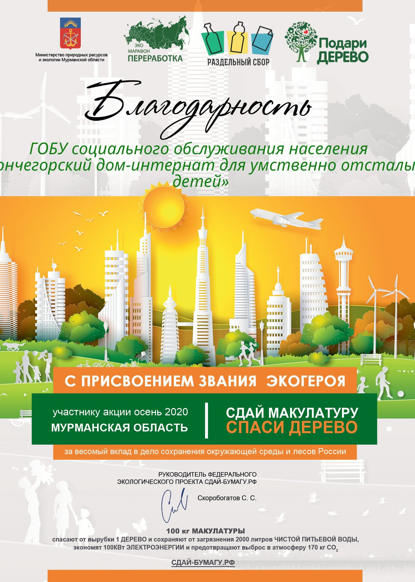 Дом-интернат сдал более 300 кг, за что награжден благодарностью за весомый вклад в дело сохранения окружающей среды и лесов России с присвоением звания «Экогероя». Традиционный сбор макулатуры у населения даёт возможность производителям бумаги экономить остродефицитное древесное сырье, а жителям Планеты – ее ресурсы, а также является частью программы по созданию отрасли по раздельному сбору отходов в соответствии с поручением Президента РФ.