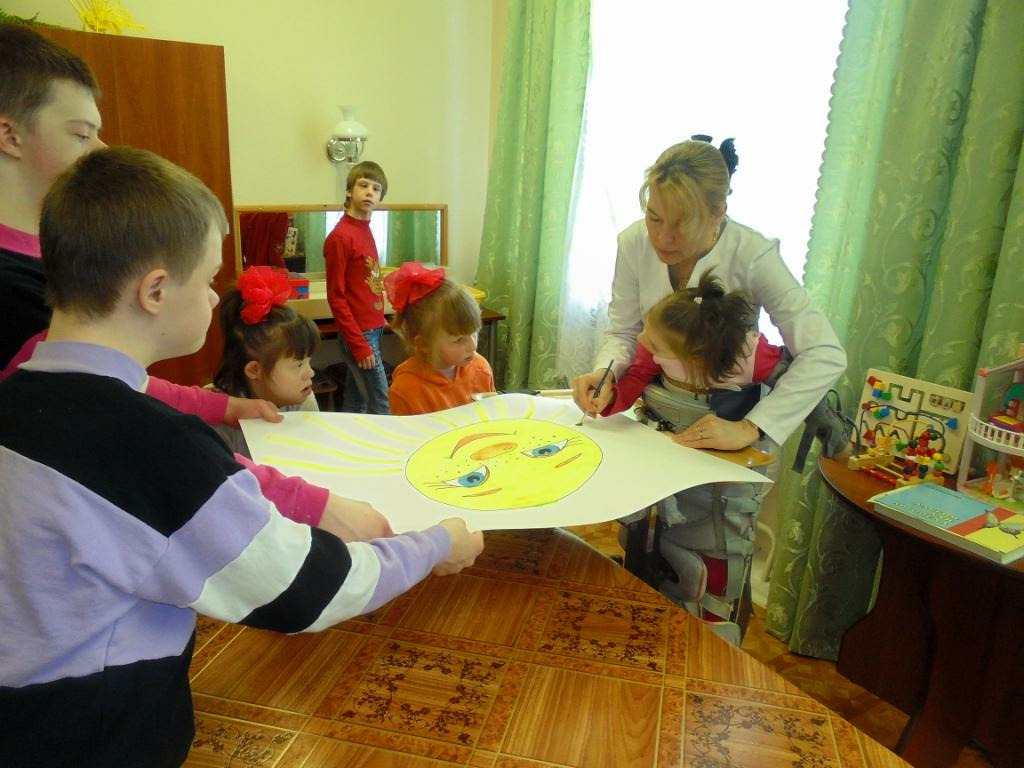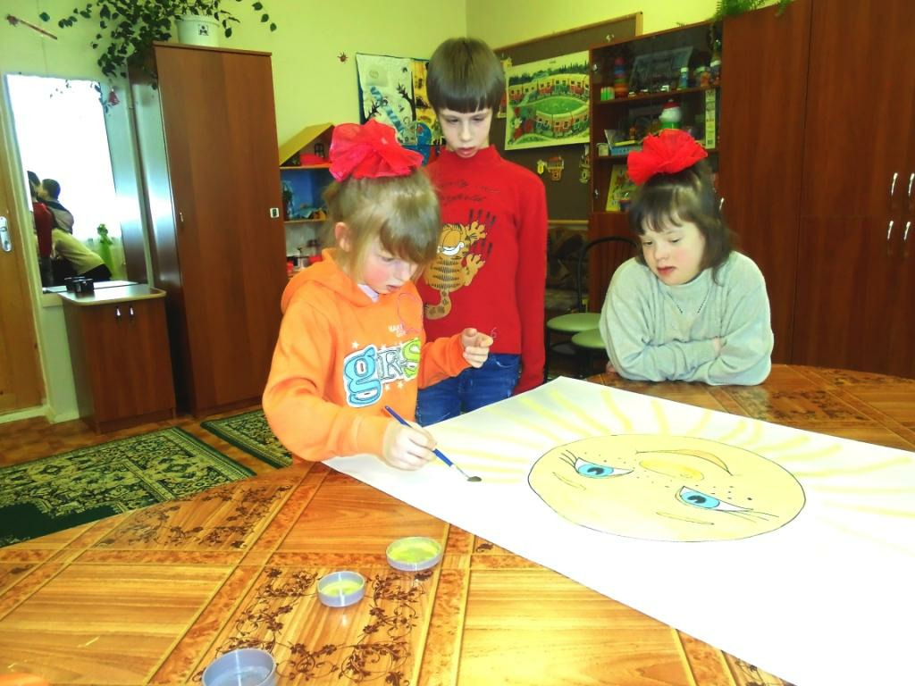 Весенние задорные песенки, краски и кисти были на занятии теми инструментами, с помощью которых ребята создавали свою солнечную погоду.