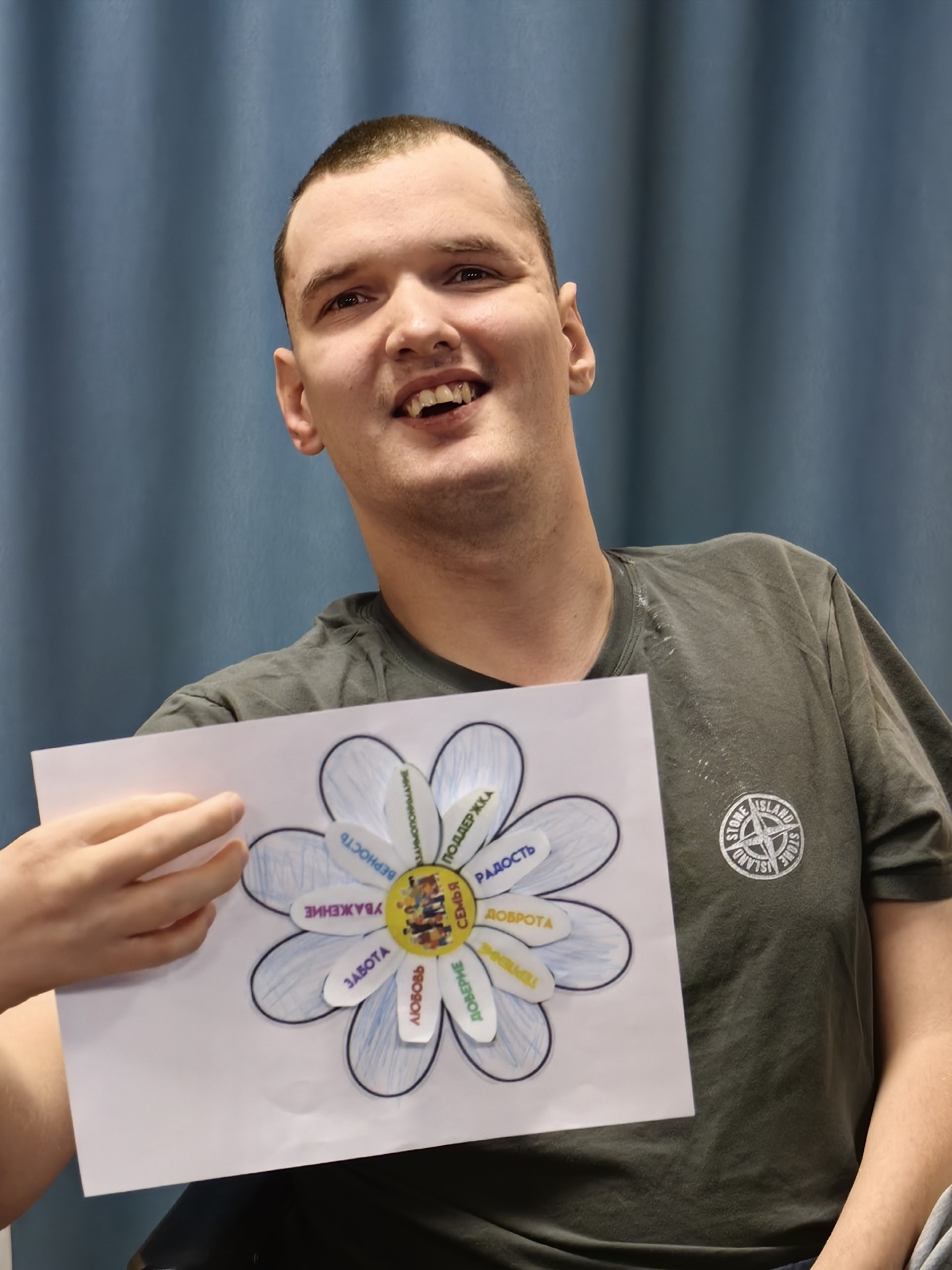 | Человек держит бумажный цветок | Девушка держит в руках поделку | Воспитанник держит в руках рисунок |