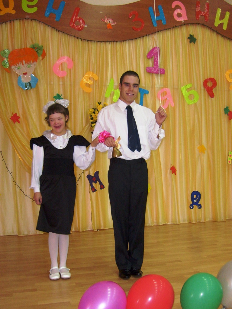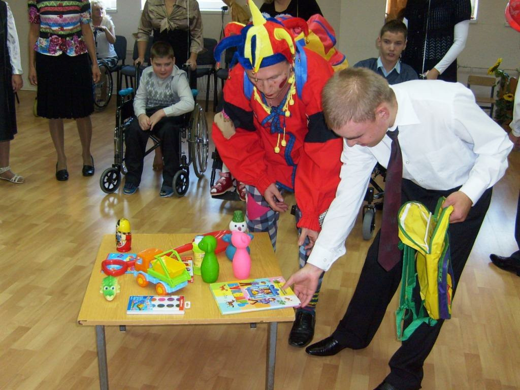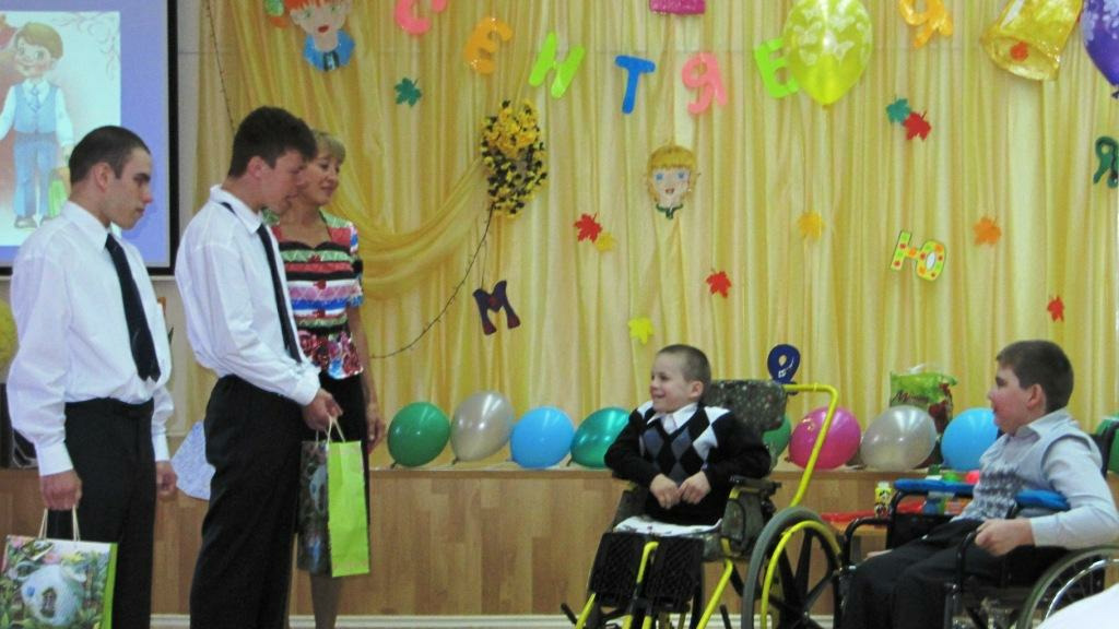 Для воспитанников Алёши С. и Серёжи Г. школьный звонок прозвучал первый раз. Ученики 6 класса Вова Ш. и Саша К. напутствовали их добрыми словами и подарили подарки со школьными принадлежностями.
