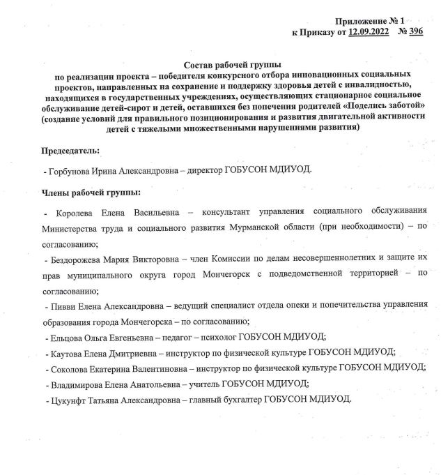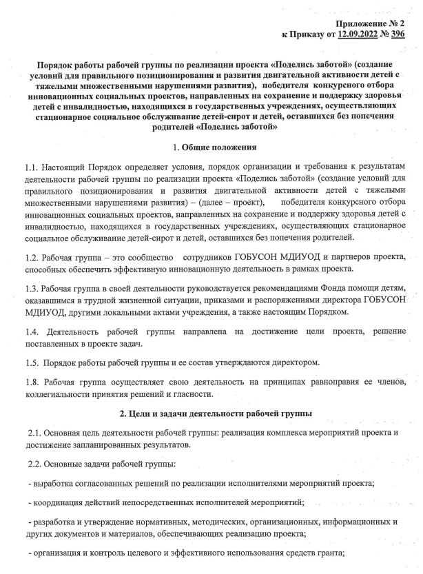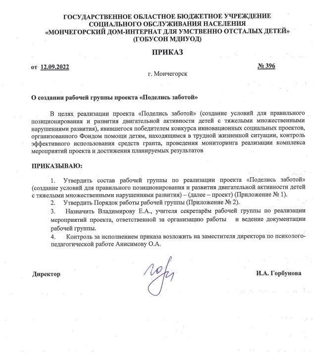 Приказ о создании рабочей группы проекта «Поделись заботой»